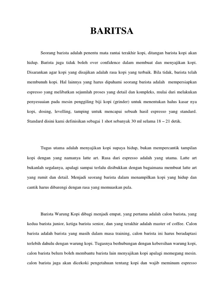 Tugas Barista Adalah - Tugas Captain Barista / Barista adalah sebutan untuk pekerjaan seseorang yang tugas dan tanggung jawabnya melayani dan menyiapkan minuman kopi di kedai/kafe.. Secara umum, arti barista adalah sebuah profesi yang pekerjaannya membuat dan menyajikan kopi kepada pelanggan. Jenis minuman satu ini memang . Pengertian dari barista adalah sebuah profesi seseorang yang pekerjaannya membuat dan menyajikan kopi kepada pelanggan. Barista adalah sebutan untuk pekerjaan seseorang yang tugas dan tanggung jawabnya melayani dan menyiapkan minuman kopi di kedai/kafe. Tugas barista ternyata tidak sekedar membuat dan menyuguhkan minuman saja, tetapi juga serangkaian tugas lain di kafe tempat mereka bekerja.