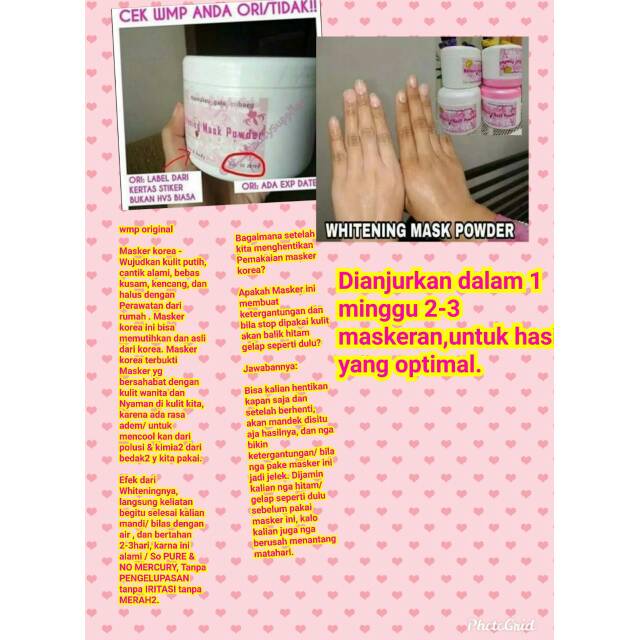 Masker korea ini bisa memutihkan dan asli dari korea. Cek whitening mask powder ori atau whitening mask powder kw sebelum . Whitening mask powder original dijamin asli dari korea/ not local product,. Jual wmp whitening mask powder masker pemutih wajah dan tubuh original 100% terbaru online di blibli ✔️ penjual terpercaya ✔️gratis ongkir ✔️jaminan . Harga asli masker korea / wmp / whitening mask powder murah.